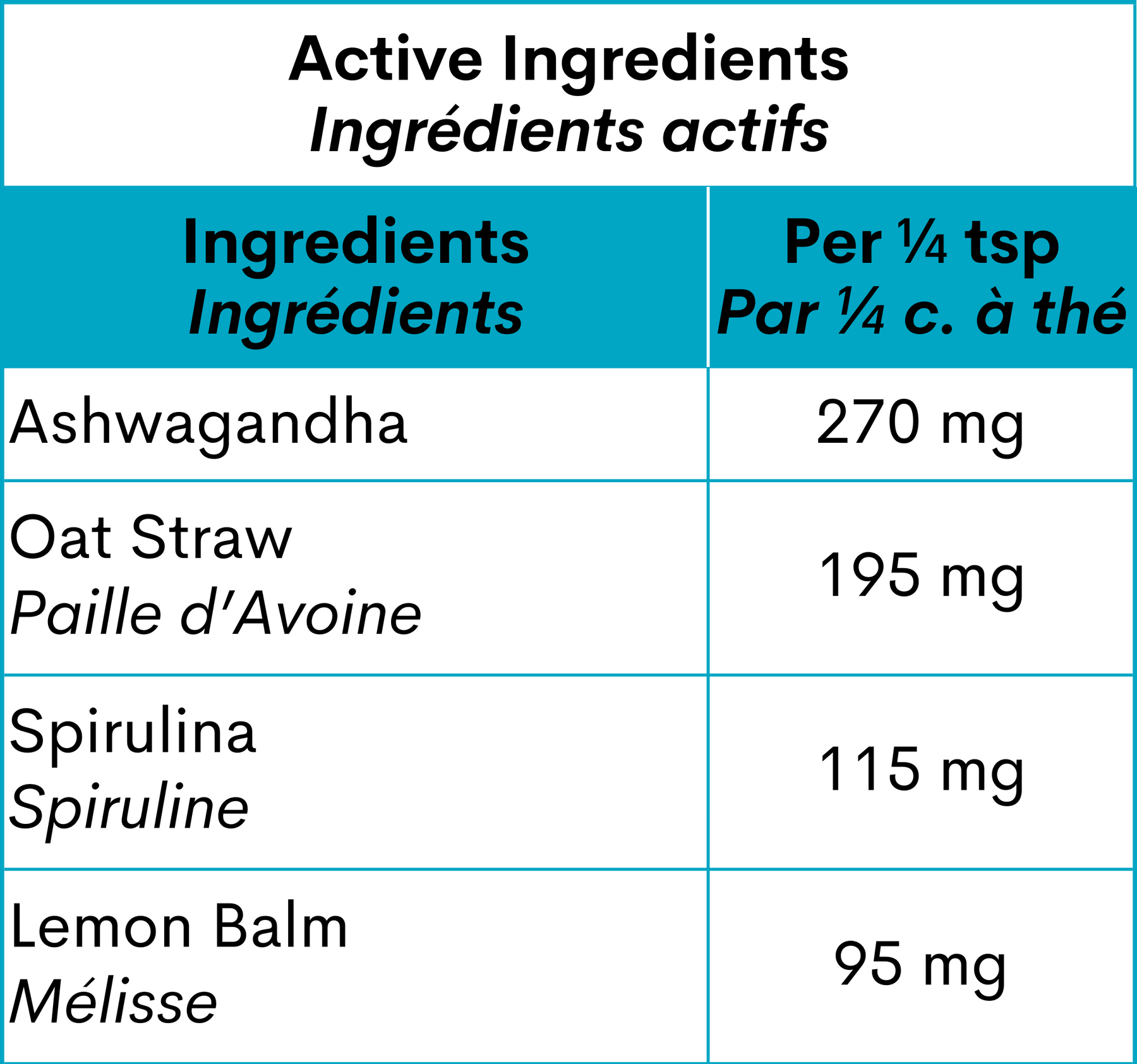Ingredients: Ashwagandha, Oatstraw, Spirulina, and Lemon Balm.
