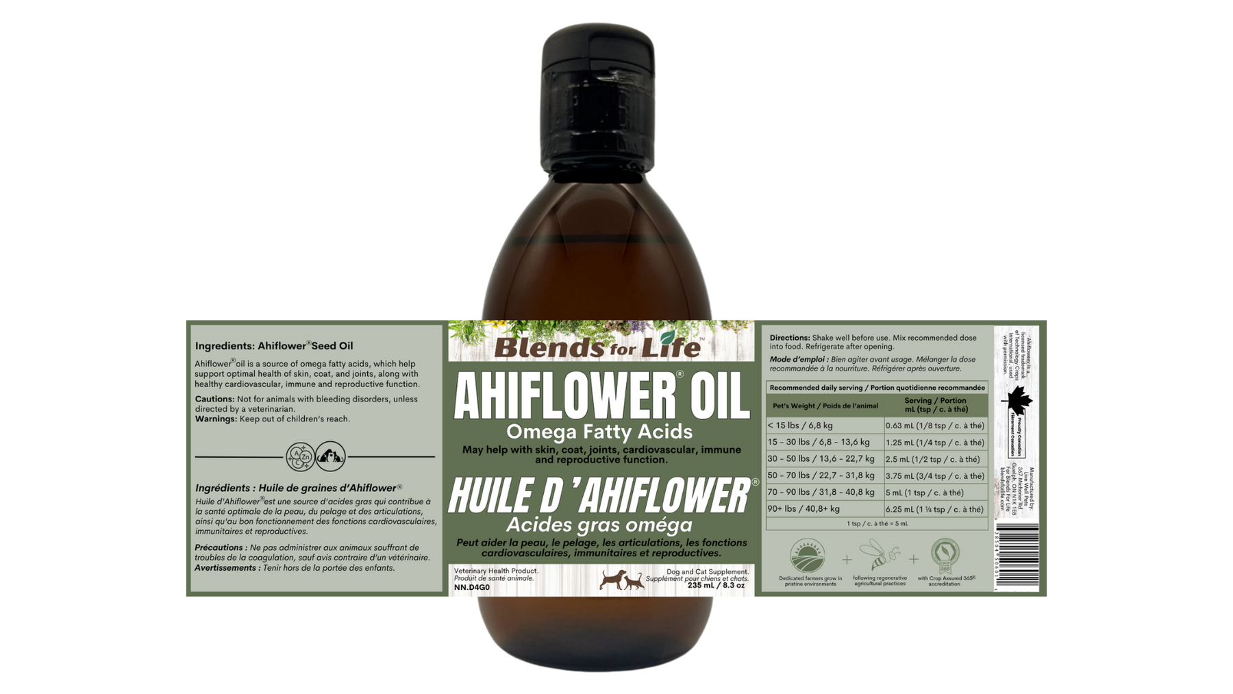 Ahiflower® Oil is a unique plant-based source of omega fatty acids that help support your pet’s overall vitality. These omegas contribute to healthy skin, a glossy coat, and comfortable joints, while also supporting cardiovascular, immune, and reproductive health. Sustainably grown and cold-pressed, Ahiflower® Oil offers a clean, eco-friendly alternative to marine-based oils.