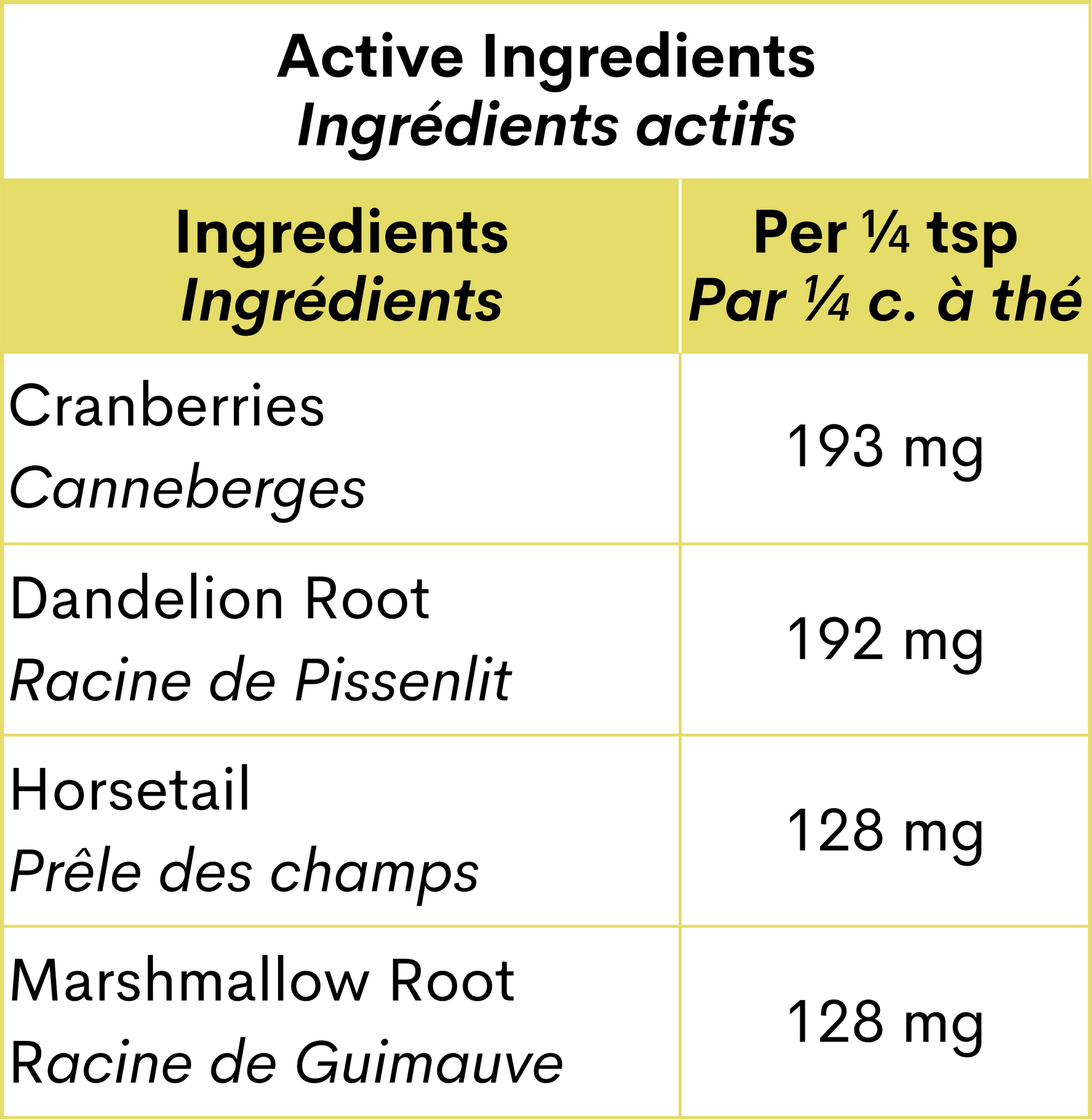 Ingredients: Cranberry, Dandelion Root, Horsetail, and Marshmallow Root.
