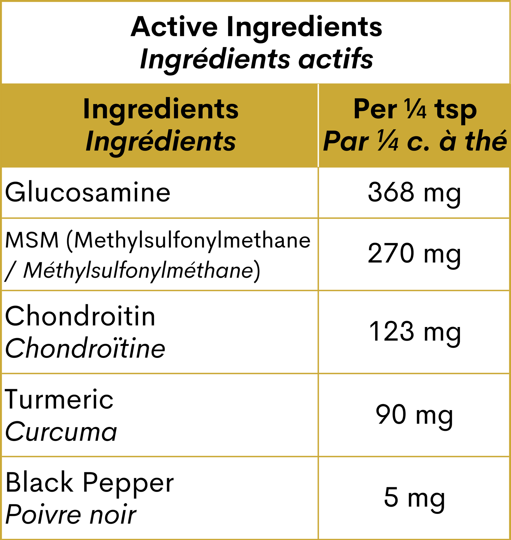 Ingredients: Glucosamine, MSM, Chondroitin, Turmeric, and Black Pepper.