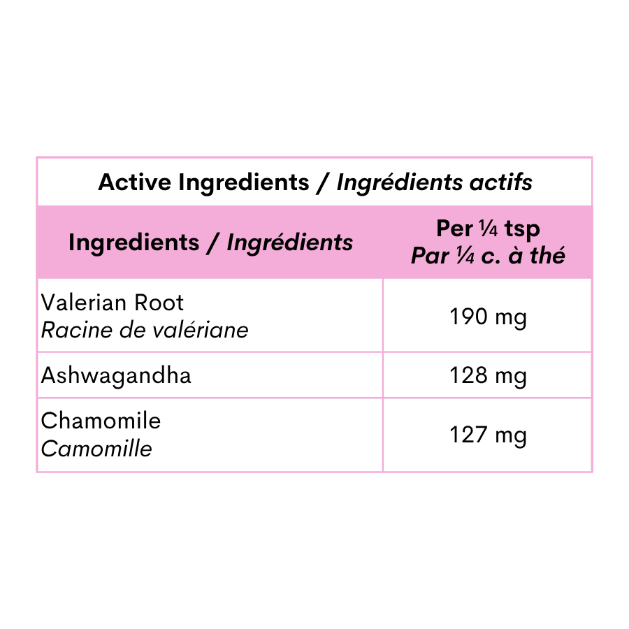 Ingredients: Valerian Root, Ashwagandha, and Chamomile.